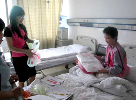 倪建英到医院看望汪文俊并送去了学习用品